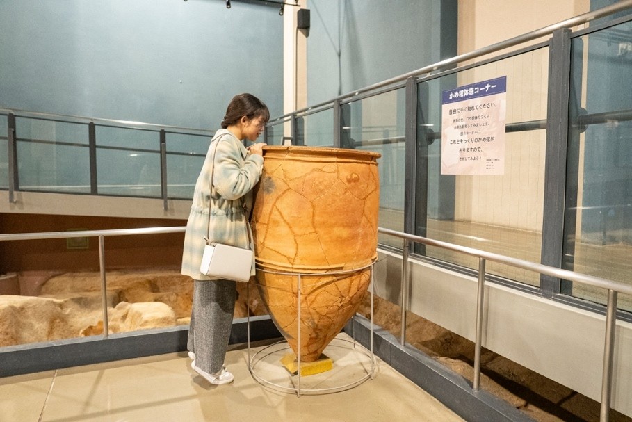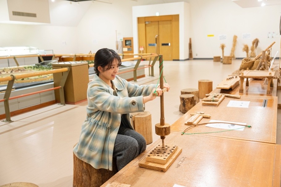 復元集落ゾーンから道路を挟んで西側にある板付遺跡弥生館では、遺跡から出土した土器や石器などの展示のほか、火起こし体験や石包丁を使った当時の稲刈り体験ができます。
