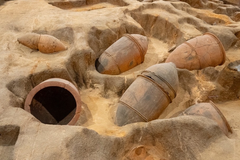 台地の上には、集落をぐるりと囲む「環濠」と呼ばれる溝がめぐらされており、その内外には、米や食料を貯蔵するための穴が数多く見つかっています。