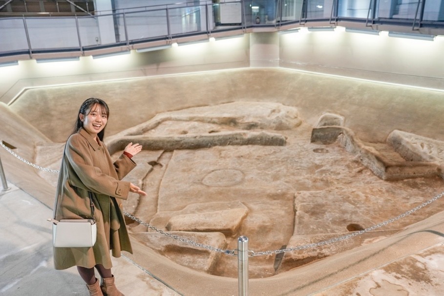 こうした発掘成果を受け、野方遺跡は昭和50(1975)年に国指定史跡となりました。現在は展示館の中に弥生時代と古墳時代の住居跡が発掘当時さながらの姿で保存・展示されています。竪穴住居は知っていても、どのような形で発掘されているのかまでは知らない方も多いのでは!?室内展示のため、雨の日でもOK!福岡の歴史を少し深掘りしたいときに、ぜひ立ち寄りたい史跡です。