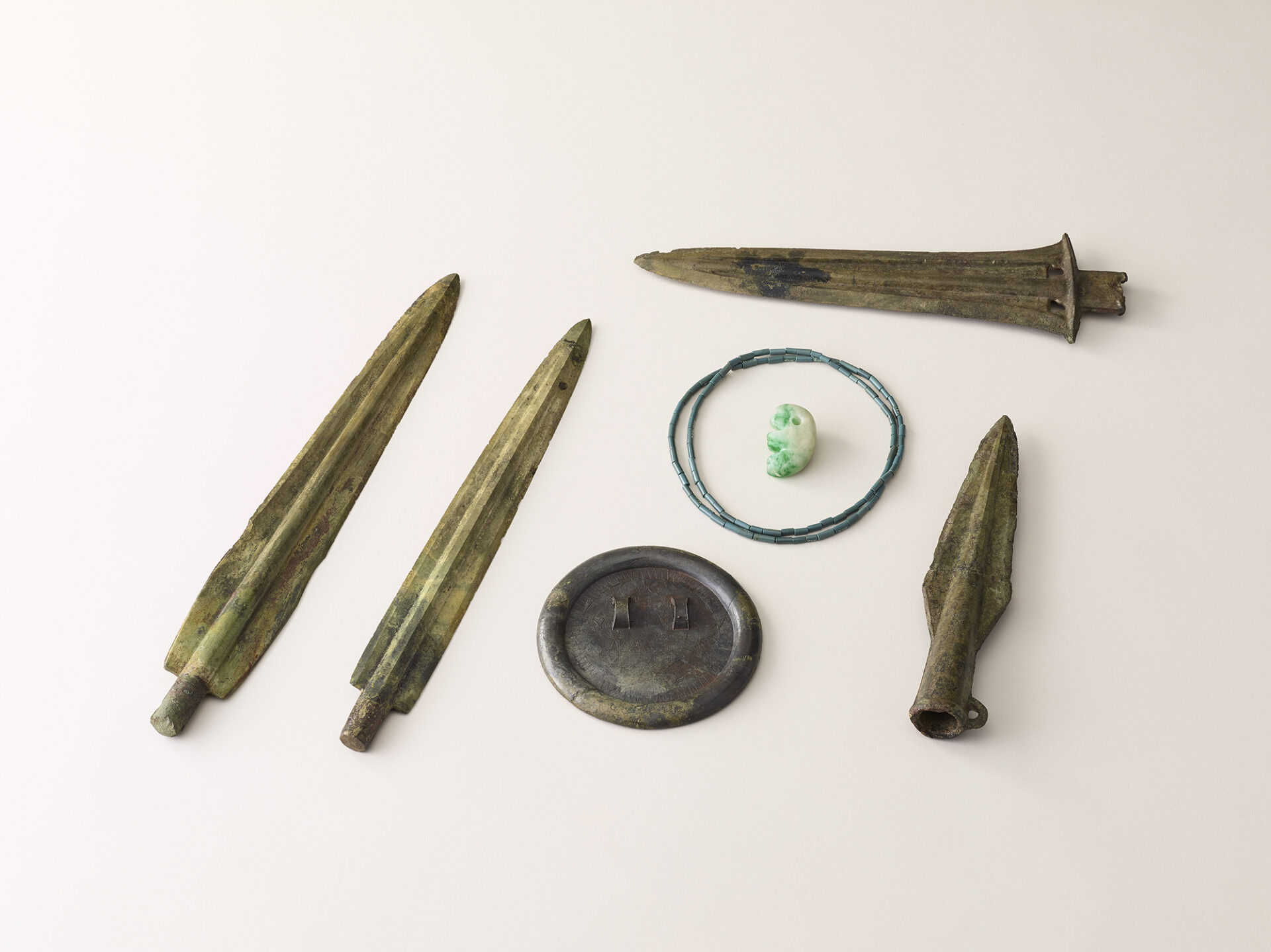 吉武高木遺跡からは、大きな掘立柱住居やたくさんの甕棺墓が見つかっていますが、特に注目されるのは3号木棺墓。大きな木の棺の中に、当時非常に貴重であったヒスイ製の勾玉と青銅製の剣、鏡が副葬されていました。「三種の神器」とされる勾玉、剣、鏡のセットが確認される最古の例として、「最古の王墓」と称されています。