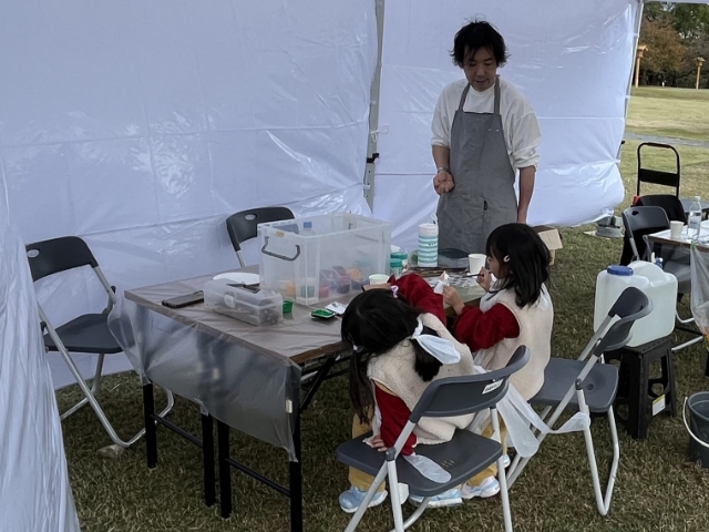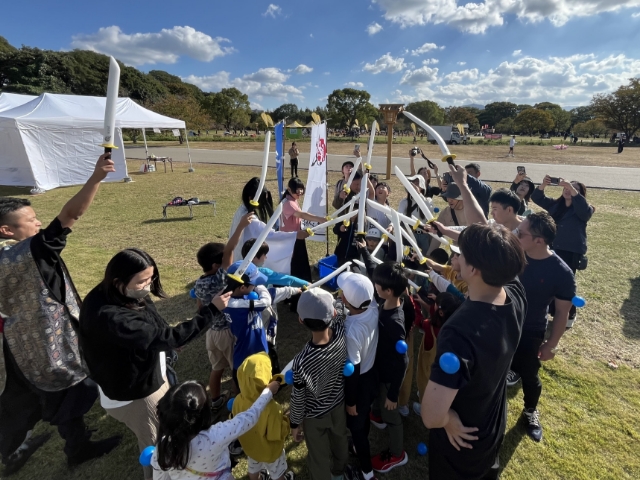 1日目は、子供たちが走り回れるチャンバラ合戦や伝統工芸体験のワークショップを行いました。